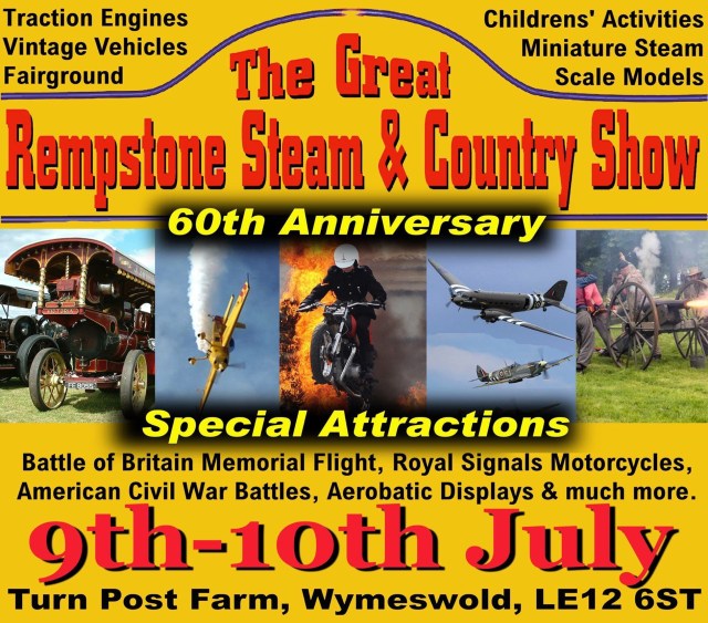 Celebrating our 60th Anniversary the Battle of Britain Memorial Flight will provide displays on both days and we are pleased to welcome the famous Royal Signals Motorcycle Display Team as our main arena event each day. There will also be the spectacular aerobatic display which amazed us last year with daredevil stunts in the skies over the showground. The American Civil War Society are appearing with their battle re-enactments, including cannon and rifle fire. With 30 acres of exhibits including 50 full size steam engines, some of whom attended that first show. There will also be Miniature Steam, Vintage and Classic Cars, Motorcycles and Commercials, Tractors, Barn engines, Models and Crafts, plus the Sentinel Club bringing both steam and motor examples. There’s plenty for children to do; Bouncy Castles, Slides, Funfair, Wildlife, Face Painting, Punch and Judy and lots more. There is a large Market, Real Ale Bar & a variety of foods. A Charity Fundraising Event. 10.00am to 5.00 pm each day (Evening Entertainment Saturday) £8 adult, £4 under 18, Under 5 Free. Free Car Parking.