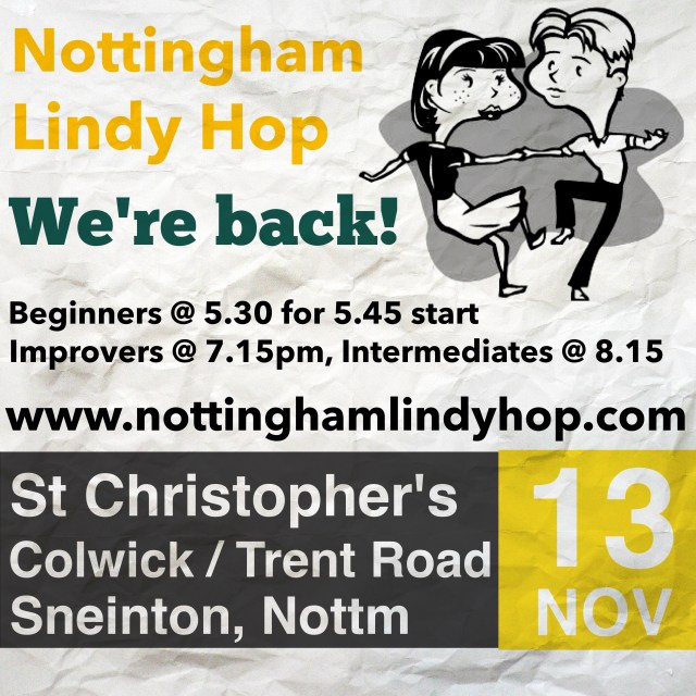 Good news folks! After far too long a break, we’re back! Hurrah!! We’ll be starting Lindy Hop classes again at St Christopher’s Church Hall from Sun 13 November for 6 weeks till Sun 18 December and Solo Jazz classes at the same venue from Mon 14 Nov for 5 weeks till Mon 12 Dec. More details to follow but I just had to share the good news 🙂 I’m so looking forward to seeing you all again.
