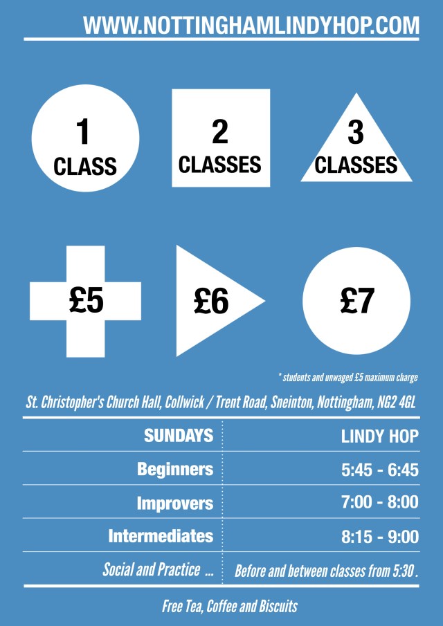 I’m really looking forward to seeing you all as we start a new run of Lindy Hop classes at our new venue, St Christopher’s Church Hall, Sneinton, this Sunday 13 November 2016.