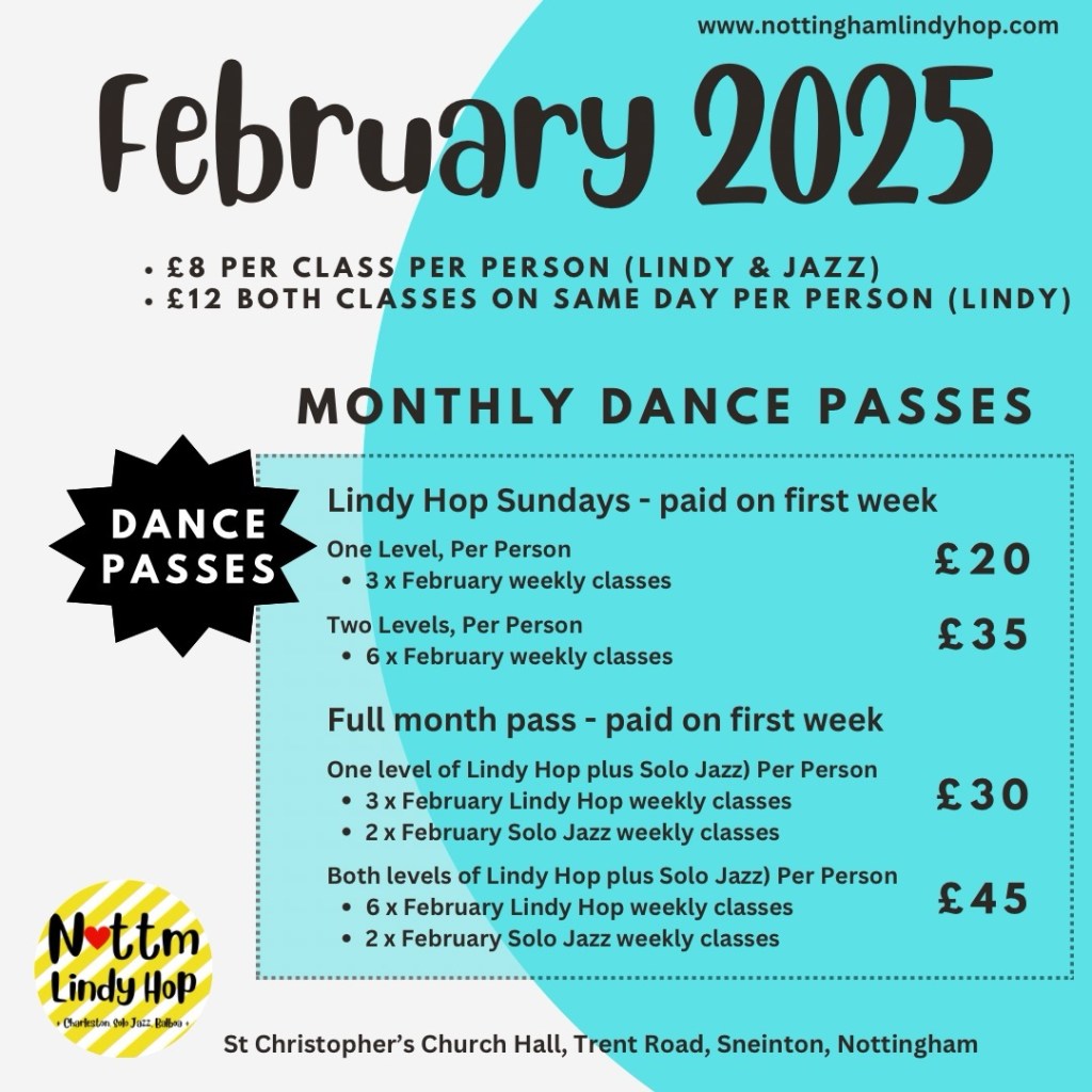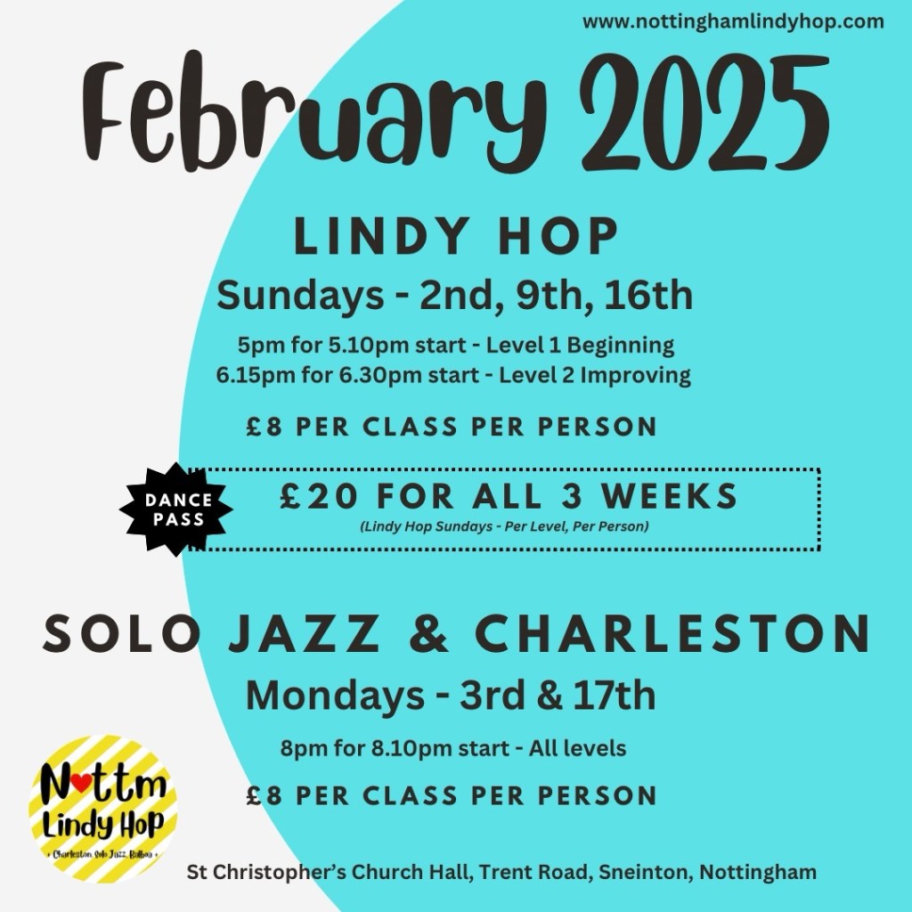 Heads Up: On Friday 31 January tickets will be finally open for NOTTINGJAM 2025. This is Nottingham’s own weekend swing dance festival organised by the University of Nottingham’s Swing Society on 7th-9th March. It’s a chance to do some intensive learning from brilliant teachers, try other swing dance styles, and dance with dancers from across the UK and beyond. Don’t miss out! I’ll be looking at how we can flex our March classes so that you can all take part without missing out on anything.